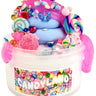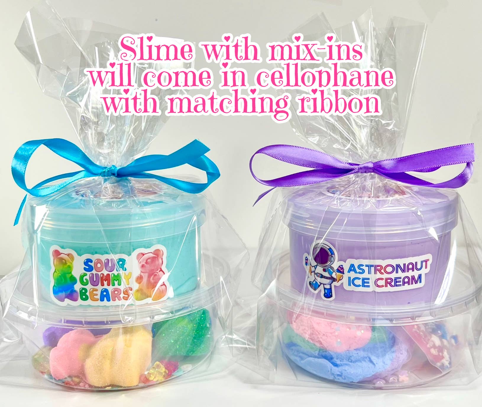 A soft and drizzly cloud scented a blend of sweet candies (think jelly bean, jolly ranchers, gummy bears) accompanied by a container full of goodies; clay, drizzle, assorted candy charms. 6oz slime with add-ins will inflate, please use enclosed deli container to store surplus slime.