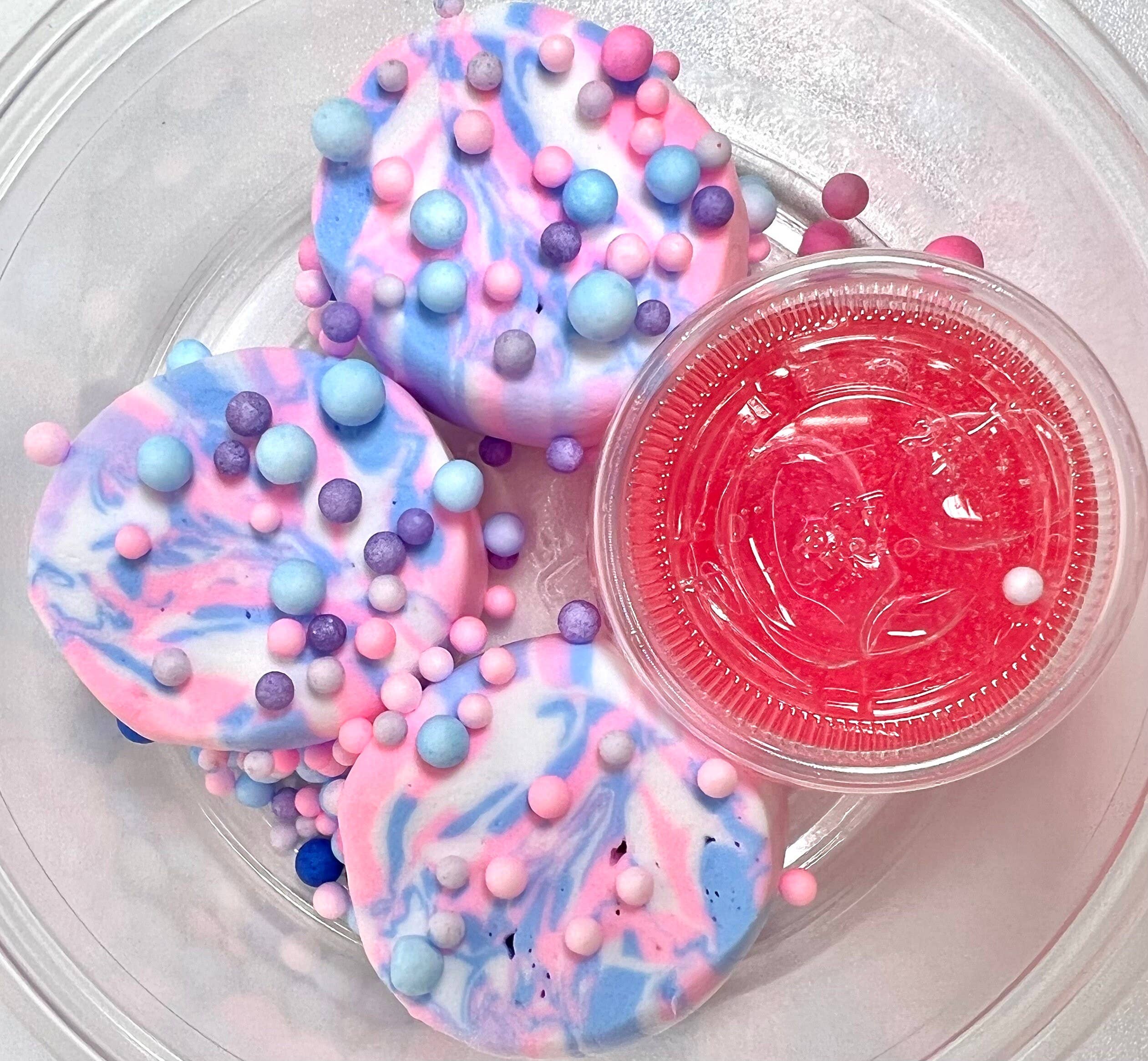 The sweetest cotton candy scent in an adorable multi color cloud dough with the cutest marshmallows and drizzle to add in yourself! 6oz slime with add-ins will inflate, please use enclosed deli container to store surplus.