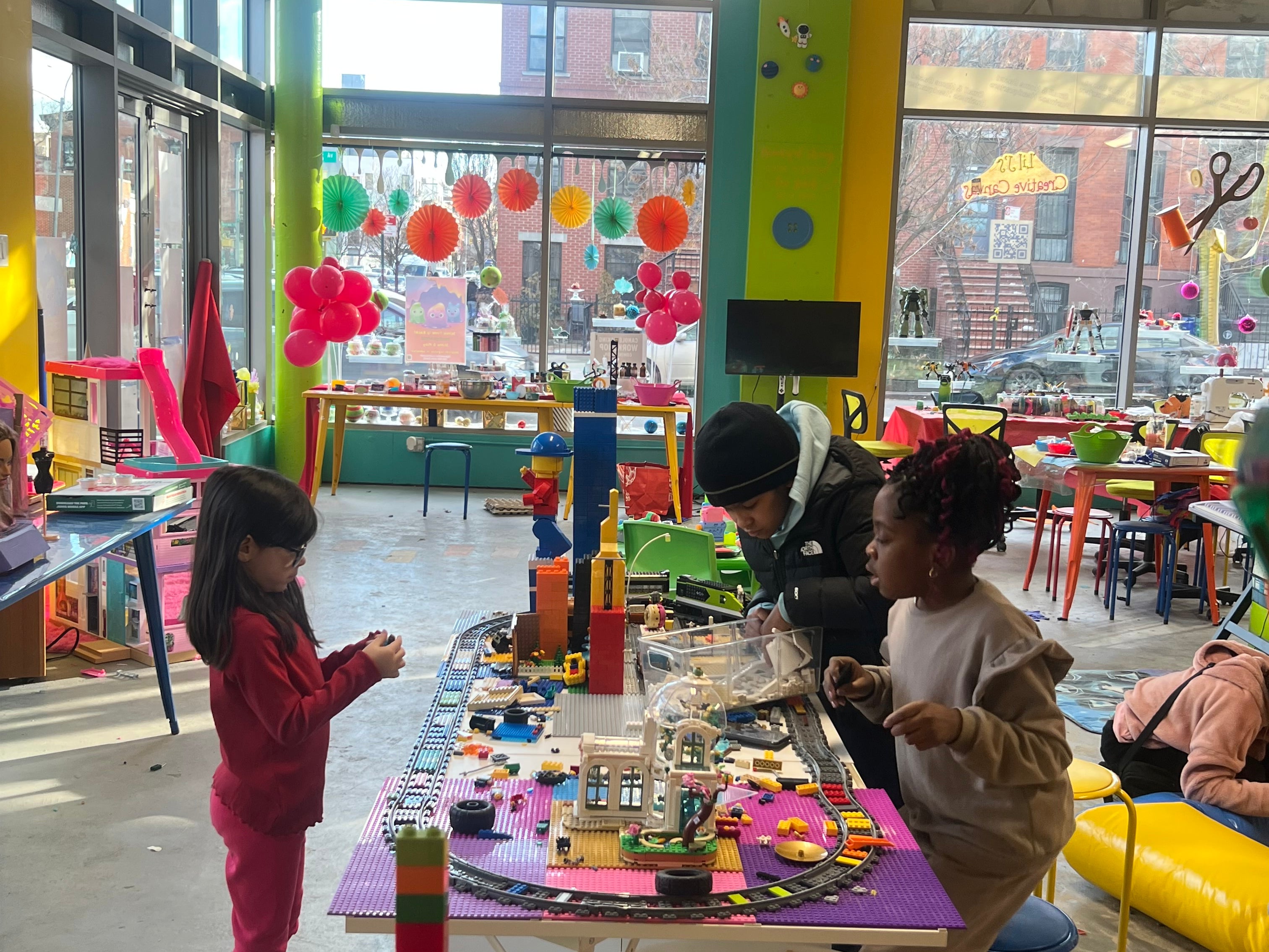 Here’s just a glimpse of the activities in Open Play: Lego and Duplo Block Building, Arcade Games, Touch Screen Fuseball, Bowling, Racecar Driving, Fashion Plates, Mini Dressform Draping, Kinetic Sand, Playdoh, Kitchen Play, Target Nerf Play, Lite Bright, Drawing, Painting, Coloring, Board Games, and a Peek at Creative Canvas Classes; Handsewing, Embroidering, Soapmaking, Bedazzling, Box Crafting, and Slime Making, just to name a few.